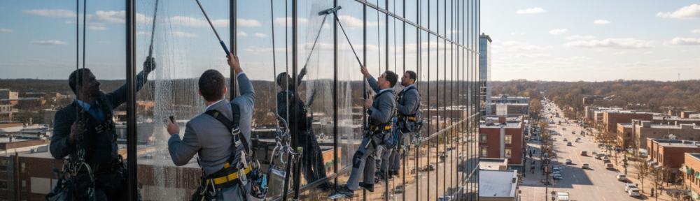 Storefront glass and lobby windows receive constant attention, so crews focus on fast service and streak-free presentation. Office windows and conference-room glass often require careful indoor access and respect for privacy. For multi-story properties, work may extend several stories high and involve specialized equipment.